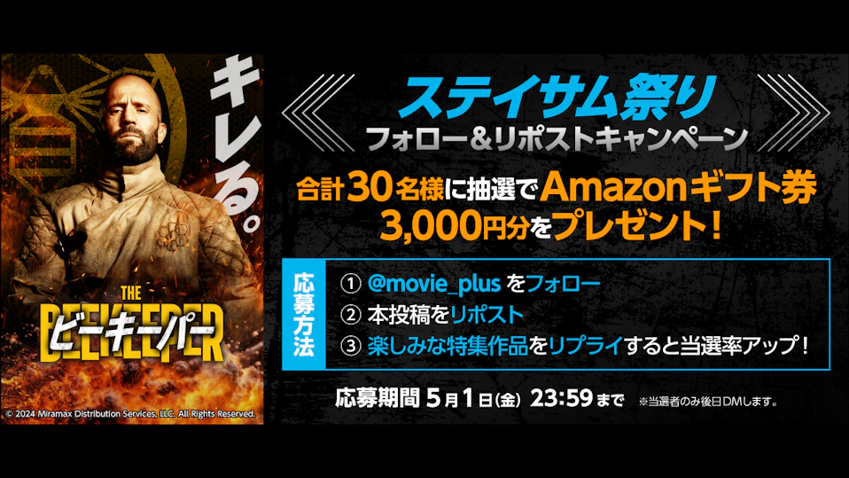 あわせて、ムービープラス【公式】X(@movie_plus)では、30名様にAmazonギフト券3,000円分が抽選で当たるフォロー&リポストキャンペーンを開催します。