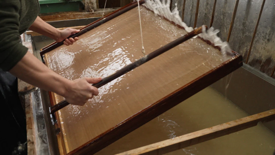 簀桁を縦横巧みに動かし紙を漉く。一枚、また一枚、山中和紙が漉き上がっていく。この土地で数百年変わらず続く伝統を、次の時代へ──。