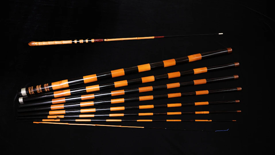 絹糸を巻いた上に漆を塗った、段巻きと呼ばれる黒い模様。長い竿全体にも漆を施し、強度と美しさを両立したのが特徴だ。