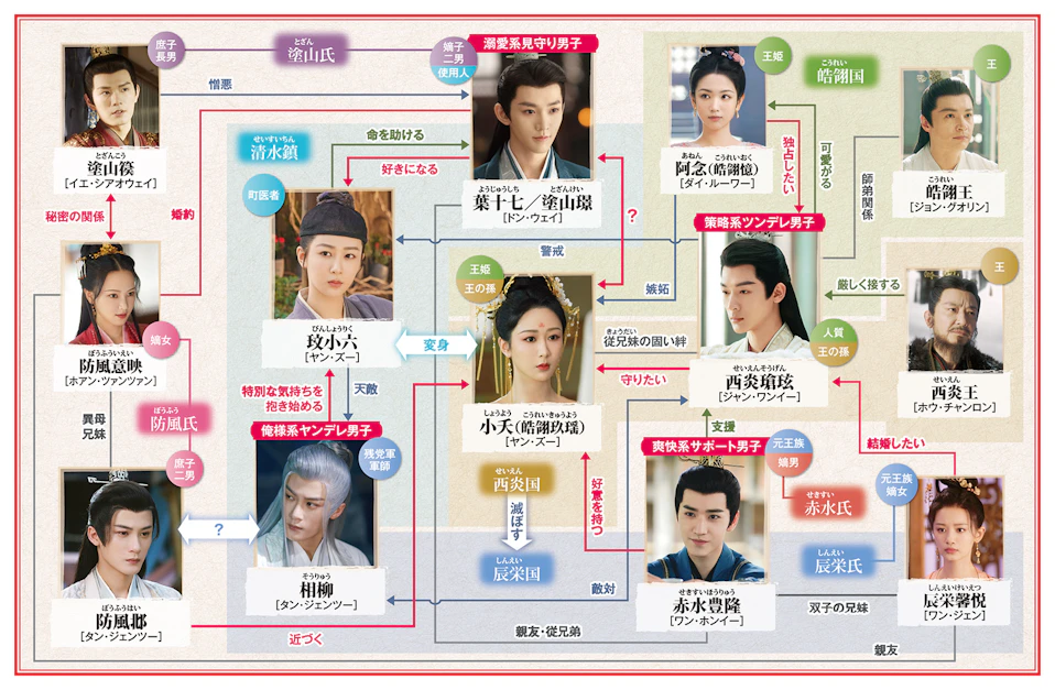 物語の舞台は3つの国が覇権を争い、人間と神族、妖族が入り混じって暮らす世界。国王の娘でありながら流浪の身となった小夭が、流れ着いた清水鎮で玟小六と名乗り別人として生きていく中で4人の男性と出会い、波乱万丈な運命に立ち向かっていく。見どころは何と言っても小夭と4人の男性が繰り広げる恋模様!婚約者がいながらも小夭に寄り添い一途に愛する塗山璟(とざんけい)、強い絆で結ばれた従妹の小夭への恋愛感情と王の孫としての宿命の間で葛藤する西炎瑲玹、利用するつもりで小夭に近づいた相柳は自分と同じ孤独を抱える彼女に惹かれ人知れず献身的な愛を捧げる。中盤から登場する赤水豊隆(せきすいほうりゅう)は身分を取り戻した小夭と婚約するが…。一人ひとりの心情と小夭との関係性が丁寧に綴られ、壮絶な過去やトラウマを抱えながらも人を愛し葛藤する彼らの姿は痛ましいほどに切なく、胸が締め付けられる。小夭が最後に誰を選ぶのかというロマンスの行方は、どのカップルに感情移入するかで異なるドキドキが味わえる。一方では愛する人への想いを遂げられずとも信念を貫いていく姿や、彼らを取り巻く家族や友情、国や種族を背負った人々の生きざまが熱く描かれ、人間ドラマとしても見応え十分! 勢いのある若手実力派俳優たちが紡ぎ出す濃密な物語は、最後まで見届けずにはいられない!!