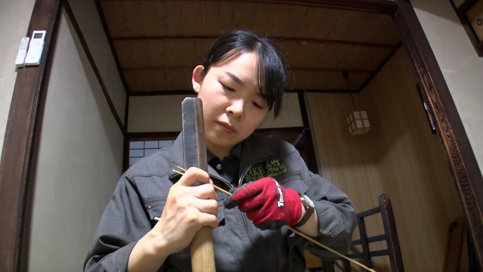 今回は一人がけのイス作りにチャレンジするめぐみさん。材料に選んだのは京銘竹の一種、白竹だ。硬くて丈夫だが、反発力も強いため難易度が高いという。