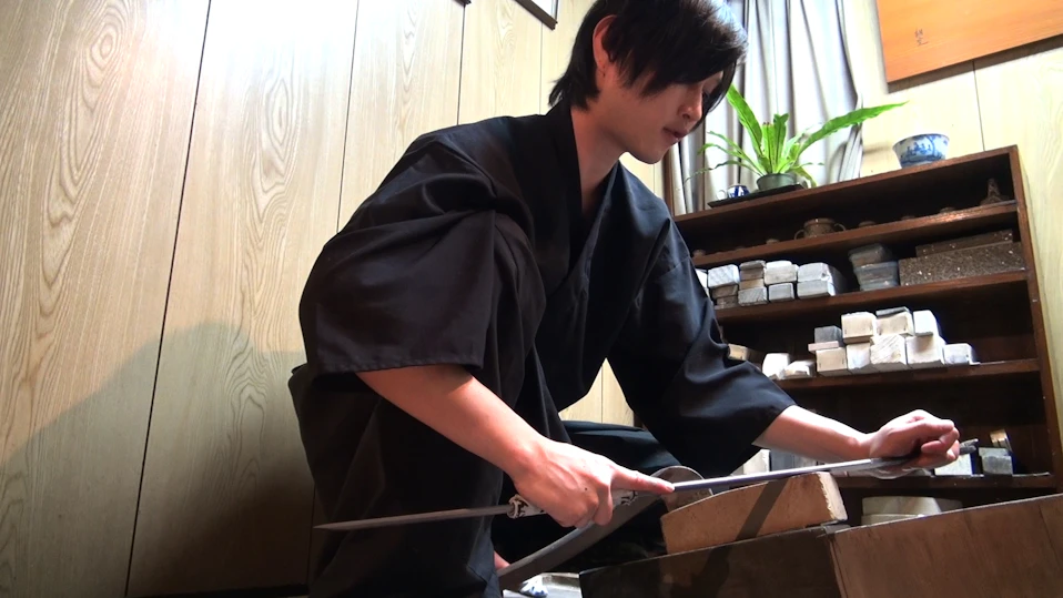 研師は何種類もの砥石を使い分けながら時間をかけて刀身を研ぐことで、日本刀に秘められた刃文を浮かび上がらせ、その刀が持つ本質的な美しさを最大限に引き出すことができる。研師がいてこそ、日本刀の美が完成する。
